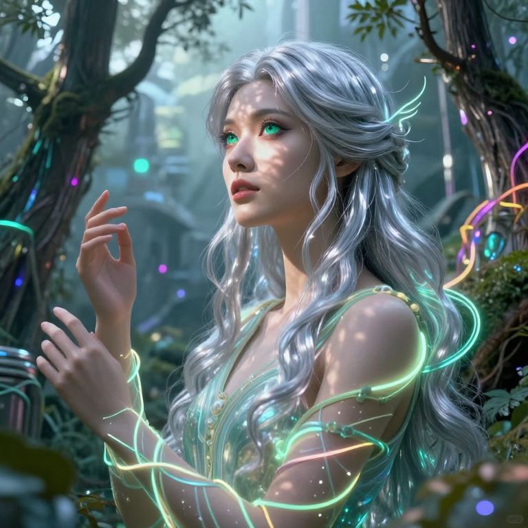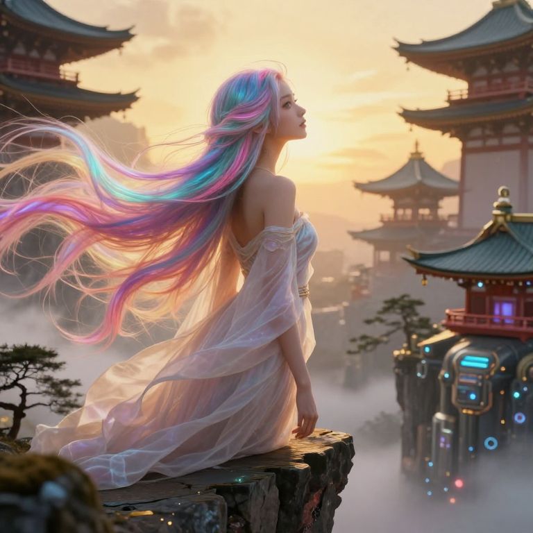 Envision an enchanting digital art portrait reminiscent of James Jean's captivating style. A mesmerizing female figure stands at the edge of a precipice, her flowing, iridescent hair cascading over her shoulders like strands of silk in a vibrant spectrum of colors. She gazes beyond the horizon with an expression that combines wonder and mystery, surrounded by a harmonious blend of traditional Japanese architecture and futuristic technology. Soft golden light illuminates her delicate features from above, showcasing both her ethereal beauty and the intricate details of the surrounding world, evoking a profound sense of awe and imagination through elements of myth, magic, and technology in this captivating tableau.