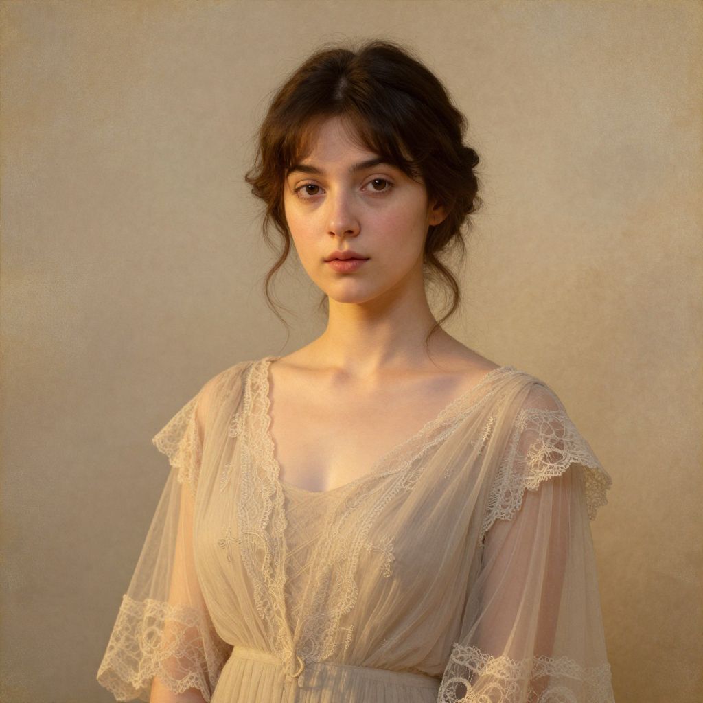 Photograph of a young woman with fair skin and dark brown, wavy hair in a loose updo, standing against a beige, textured background. She has a delicate, oval face with soft features, and is wearing a sheer, cream-colored, lace-trimmed dress with short, ruffled sleeves and a deep V-neck. The dress is slightly gathered at the waist, highlighting her slender figure. She has a neutral expression and is looking directly at the camera. The lighting is soft, creating a gentle, romantic atmosphere. The image has a slightly vintage, painterly quality, reminiscent of classical portraiture.