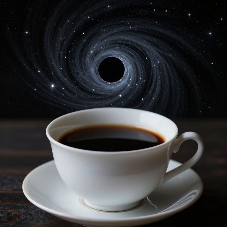 A black hole exists not in space, but at the bottom of a bottomless teacup, swirling with starlight and whispering forgotten lullabies.