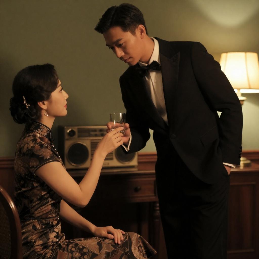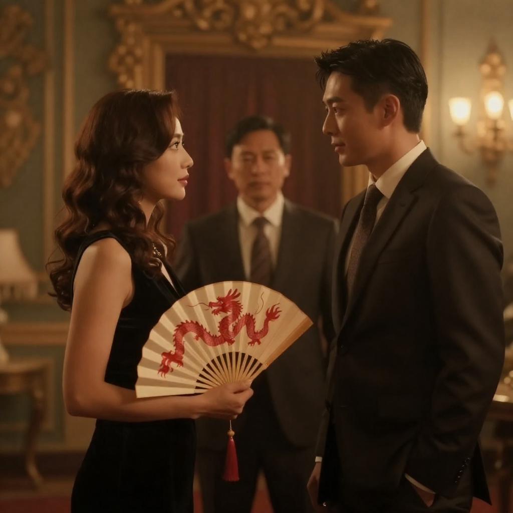 Photograph of a dimly lit, ornate room. A woman with wavy brown hair, wearing a black sleeveless dress, holds a decorative fan with a red dragon design. She faces a man in a dark suit and tie, who looks at her intently. A third man in the background watches them. Warm, golden light illuminates the scene.