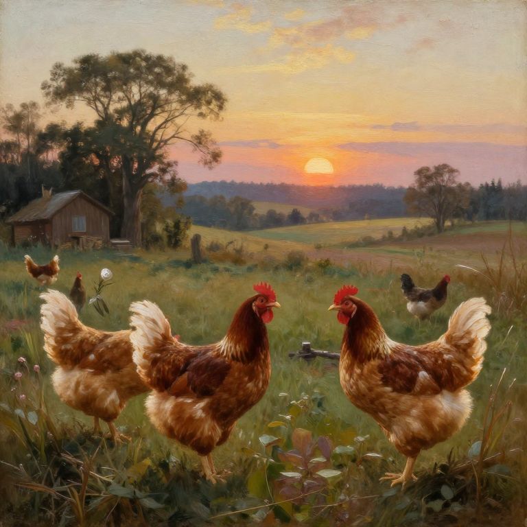 Critically Acclaimed english oil painting, pastoral, chickens, sunrise, photorealistic, detailed, painterly,