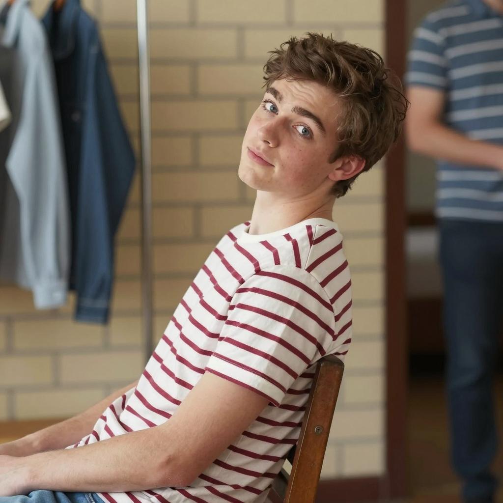 Young man with short brown hair, wearing a white and red striped shirt, sits leaning back on a wooden chair. Background includes a yellow brick wall, clothes on a hanging rack, and a blurred person in a blue striped shirt.