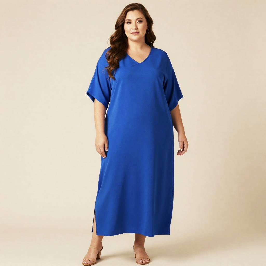 Plus Size Caftan Dress, a woman in a blue dress standing in front of a beige wall