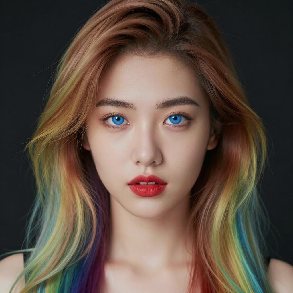 Photograph of a young woman with light pink, shaggy hair and fair skin. She has dark blue winged eyeliner, a small black mark under her right eye, and a silver lip piercing. She's wearing a black top and a layered turquoise bead necklace. The background is solid black, making her features stand out. She has a neutral expression, looking slightly to the left.