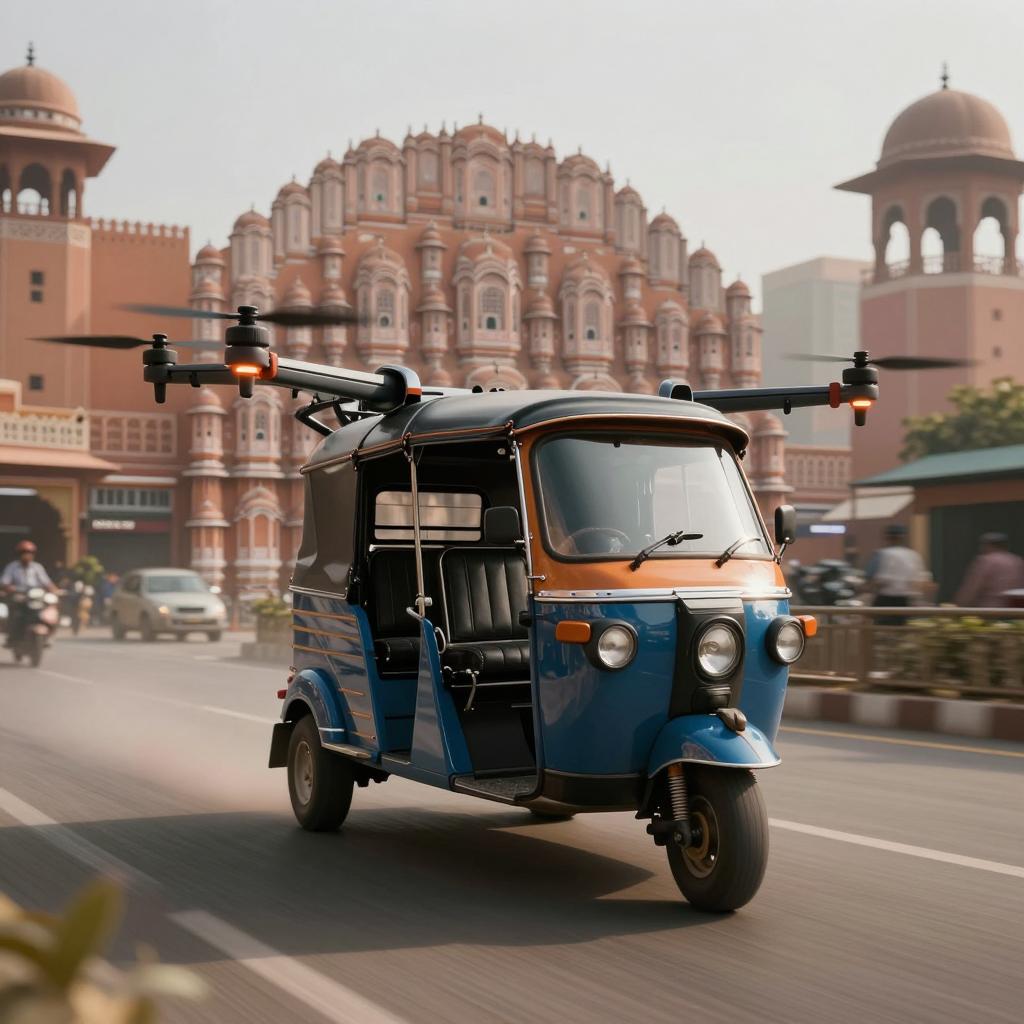 Sports tuktuk with drone wings, futuristic cyberpunk indian city, jaipur, neo mumbai, warm colours, tech, dynamic scene, ultra photorealistic muted colors, photorealistic, epic composition Unreal Engine, color grading, ultra wide angle, depth of field, hyper detailed, beautifully coloured, crazy details, intricate details, Unreal Engine, cinematic, color grading, editorial photography, photography, photo shoot, DOF, Tilt Blur, White Balance, 32k, Super Resolution, Megapixels, ProPhoto RGB, Half Moon Lighting, Backlighting, Daylighting, Incandescent, Ambient Lighting, Cinematic Lighting, Studio Lighting, Lighting soft, photorealistic, volumetric, accent lighting, global illumination, global illumination in the e Screen Space, Ray Traced Global Illumination, Optics, Scattering, Brightness, Shadows, Roughness, Glare, Ray Tracing Reflections, Lumen Reflections, Screen Space Reflections, Diffraction Gradation, Chromatic Aberration, GB Displacement, Scan Lines, Ray Tracing, Ray Tracing Ambient Occlusion, Anti - Aliasing, FKAA, TXAA, RTX, SSAO, Shaders, OpenGL - Shaders, GLSL - Shaders, Post Processing, Post Production, Cel Shading, Tone Mapping, CGI, VFX, SFX, incredibly detailed and intricate, hyper maximalist, elegant, hyper realistic, super detailed, dynamic pose, photography,