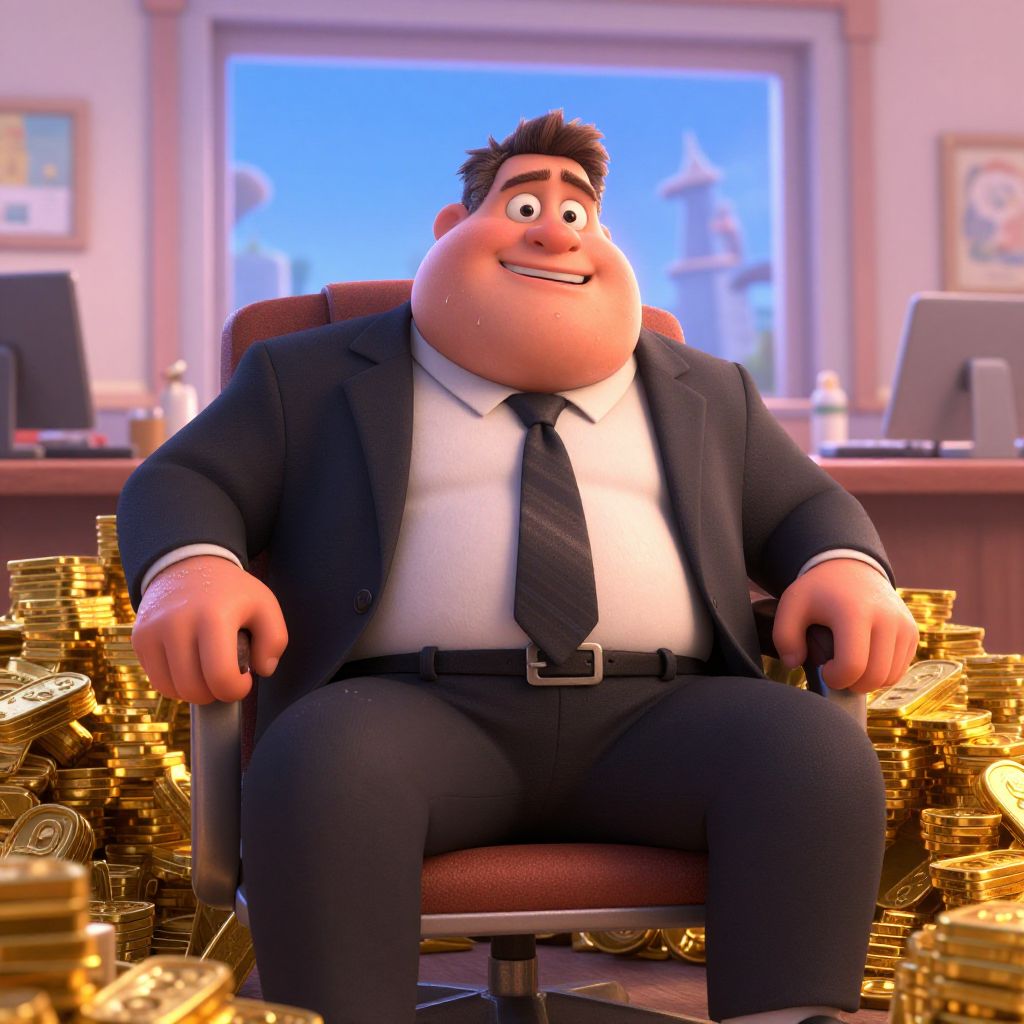 3D animated image of a massively overweight man in a black suit, white shirt, and black tie, sweating and laughing while sitting in an office chair. He is surrounded by large piles of gold coins, with a blurred view of a theme park called Dreamland visible through the office window. The scene is rendered in a colorful Pixar-style animation.