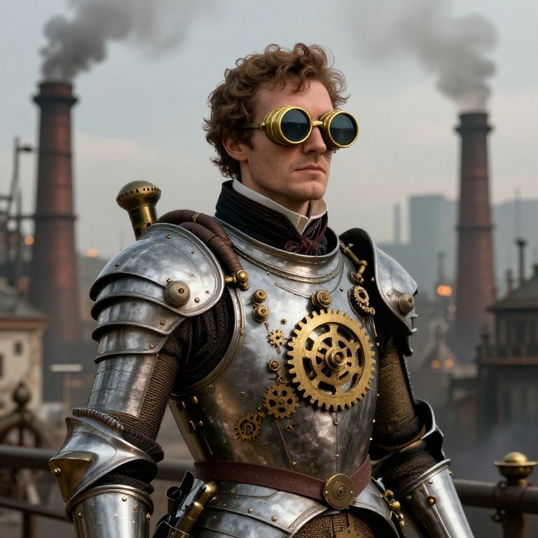 Photograph of a curly-haired man in detailed steampunk armor, wearing round yellow-tinted goggles. His polished silver armor features intricate brass gears on the chest plate. The background shows an industrial cityscape with smokestacks emitting gray smoke, and blurred buildings. The armor includes dark mesh lining and a brown leather belt with a brass buckle. The sky is overcast, adding a somber tone to the scene. The image combines a futuristic and historical aesthetic, blending industrial and steampunk elements.