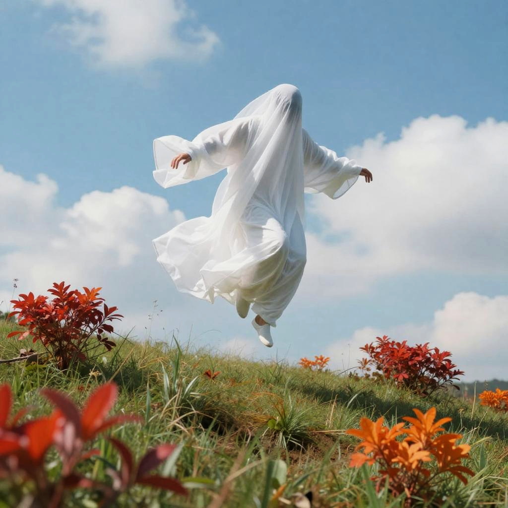 A digital artwork shows a ghostly figure in a flowing white robe, mid-jump over a grassy hill with vibrant red and orange bushes. The figure's face is hidden, and only its arms and legs are visible, with one hand slightly raised. The background features a bright blue sky with fluffy white clouds. The scene has a surreal, ethereal vibe.