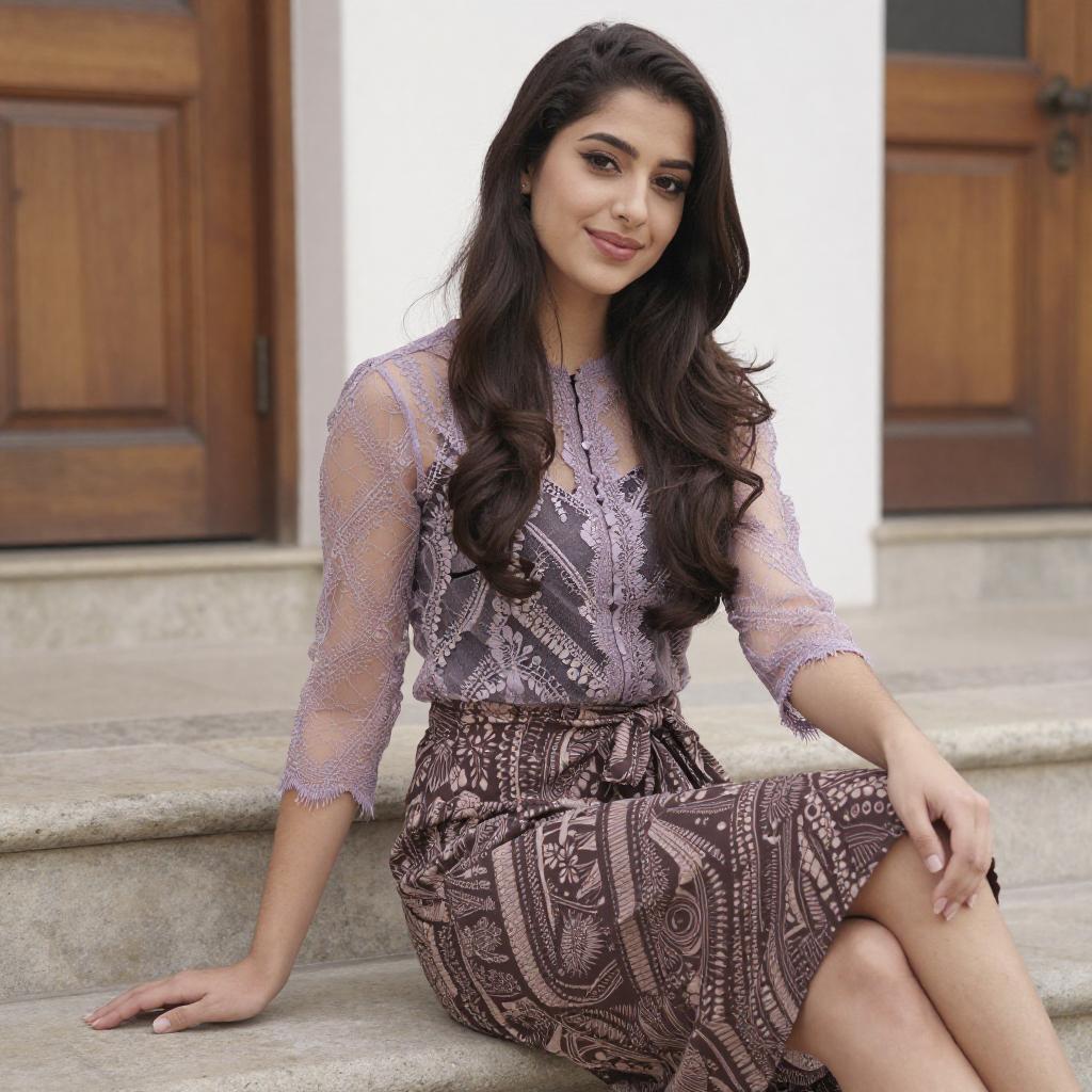 Photograph of a young woman with long, dark brown hair, sitting on stone steps. She wears a sheer, lavender lace blouse with a black underlayer and a brown, patterned skirt tied at the waist. She smiles softly, with one hand resting on the step and the other on her knee. The background includes wooden doors and a white wall.