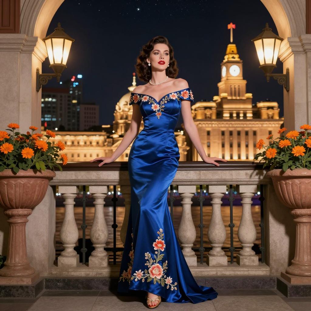 A glamorous woman in a retro vintage style, wearing a sleek dark blue satin evening gown with a slit, long black lace gloves, posed elegantly on a balcony overlooking a nighttime cityscape, illuminated by classic vintage street lamps, styled with classic 1940s curls, cinematic warm lighting, detailed shading and smooth gradients, vintage pin-up art style