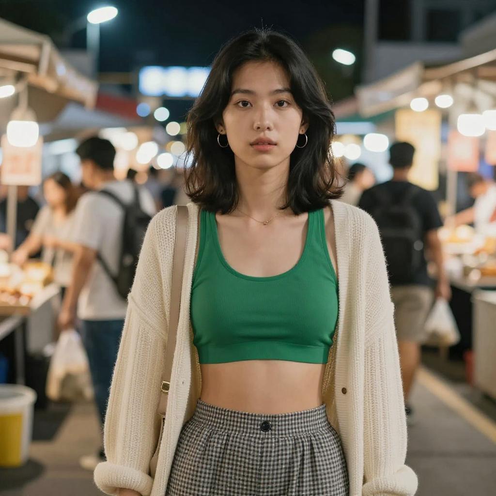 Photograph of an Asian woman with medium-length black hair standing in a bustling nighttime market. She wears a green sports bra, high-waisted black and white checkered pants, and a cream knit cardigan. Her expression is neutral, and she has small hoop earrings. The background is blurred with bright lights from market stalls, and people are visible but out of focus. The setting has a lively, urban atmosphere with a mix of warm and cool lighting.
