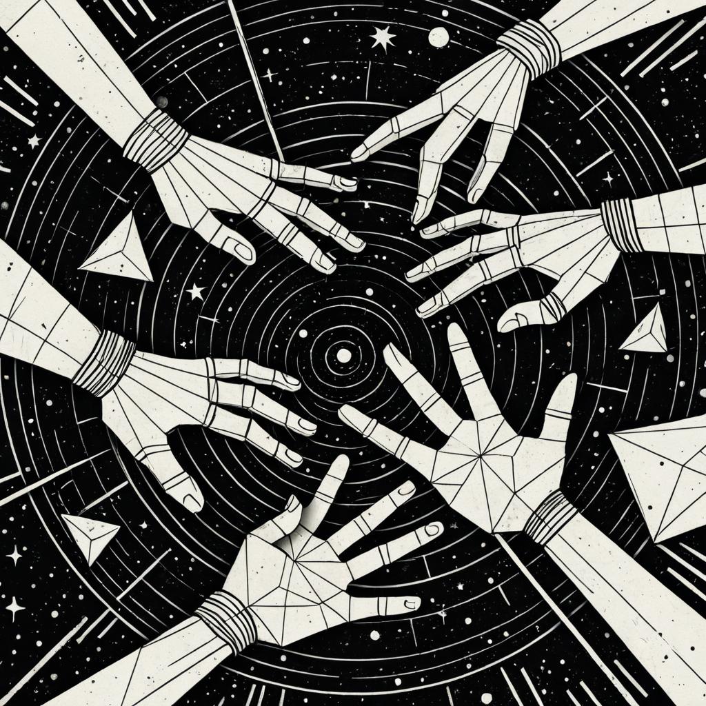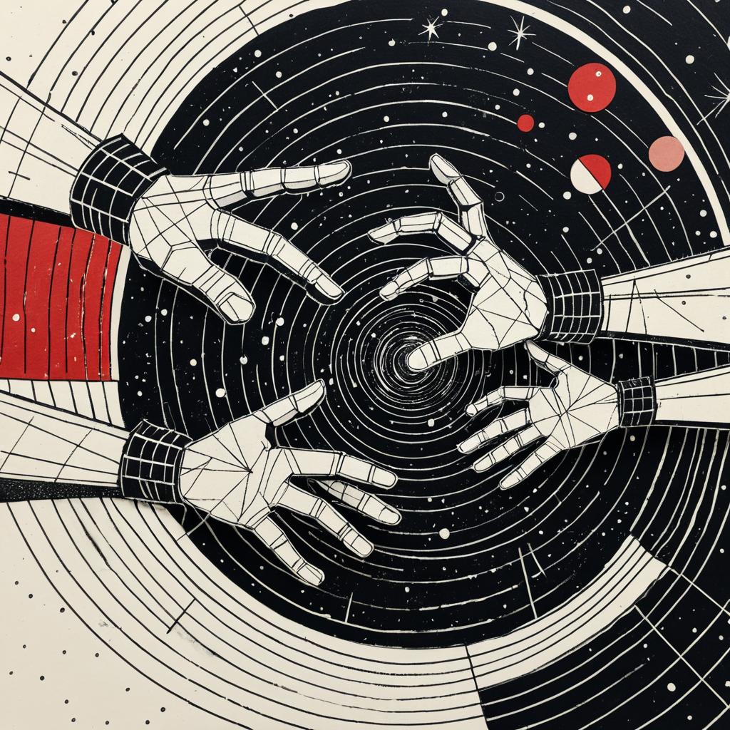 Digital artwork featuring four geometric hands with mangled fingers reaching out towards a red dot, set against a black starry space background with circular patterns and arrows. The hands are illustrated in a constructivist style with white and red tones, incorporating paper cutout and distressed textures with noise and scratches, emphasizing geometric shapes and the golden ratio.