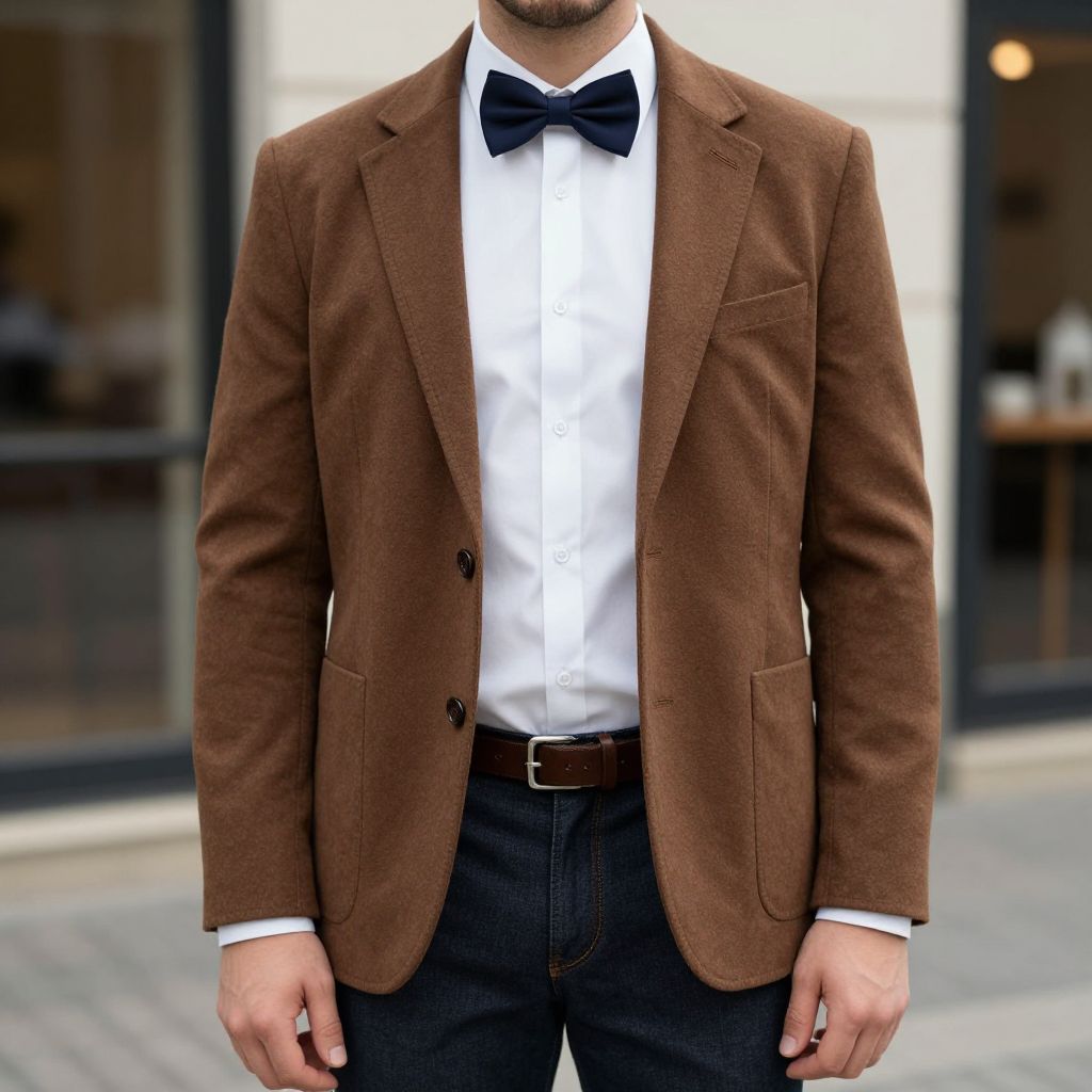 Man Preppy Outfit Costume, man in a brown jacket and bow tie standing outside