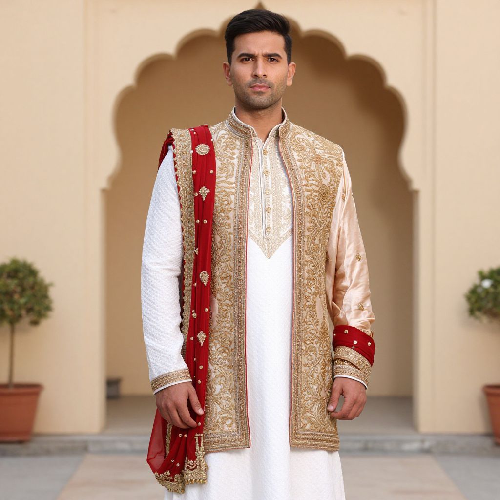 Sherwani Dulha Costume, a man in a white and red sherwani with a red and gold jacket