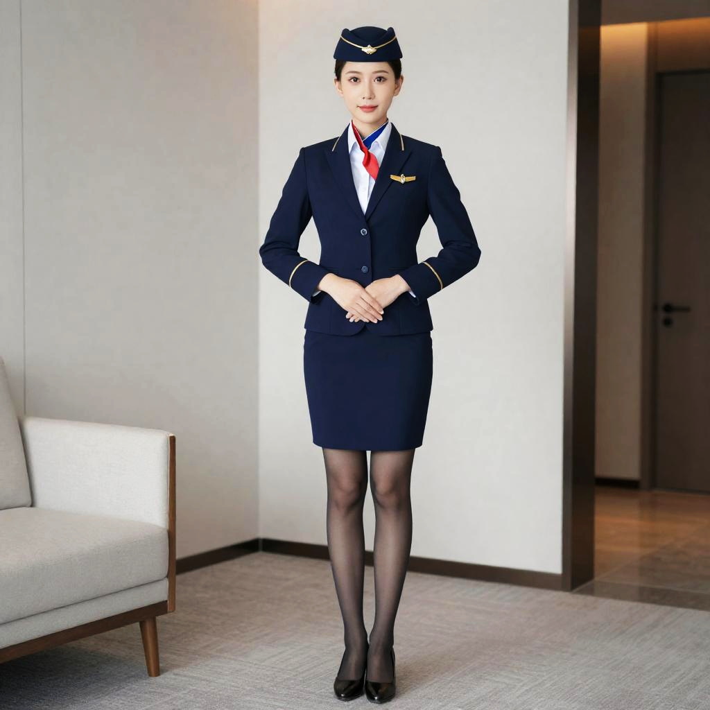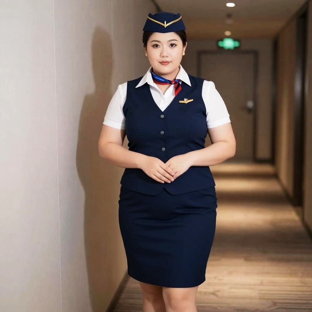 Plus Size Flight Attendant Costume Woman, woman in uniform standing in a hallway of a hotel
