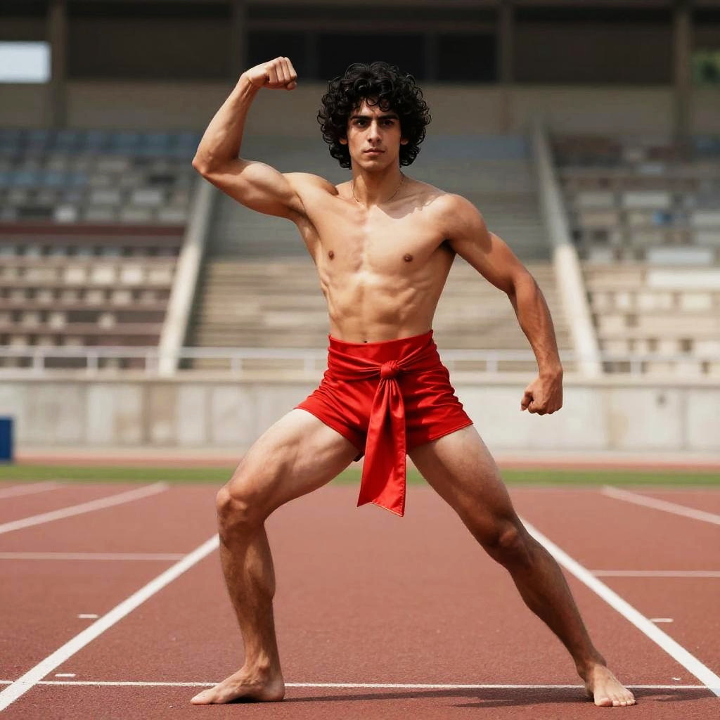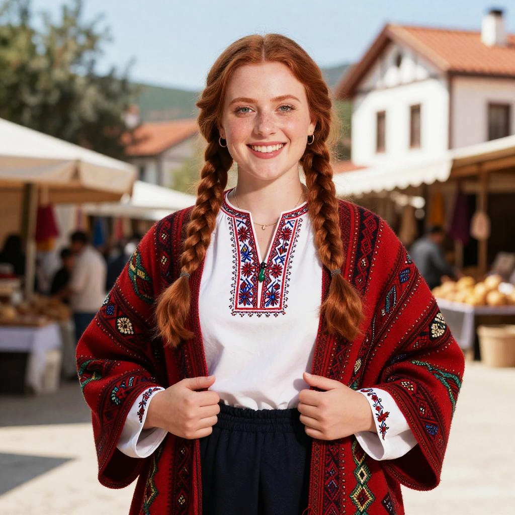 Spirited ancient merchant woman, long braided brunette hair, curvy sturdy frame, greek traditional outfit, rich crimson embroidered peplos, opulent traditional, classical port marketplace studio background