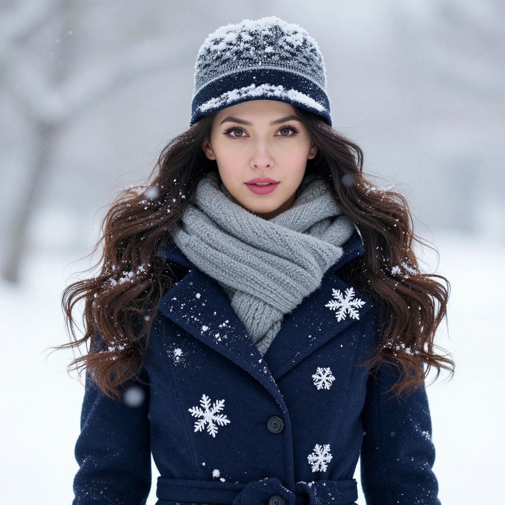 A beautiful and sexy woman with long, flowing hair, wearing a stylish winter coat adorned with intricate snowflakes, a fashionable hat, and a cozy scarf wrapped around her neck, captured in a softly falling snowfall.