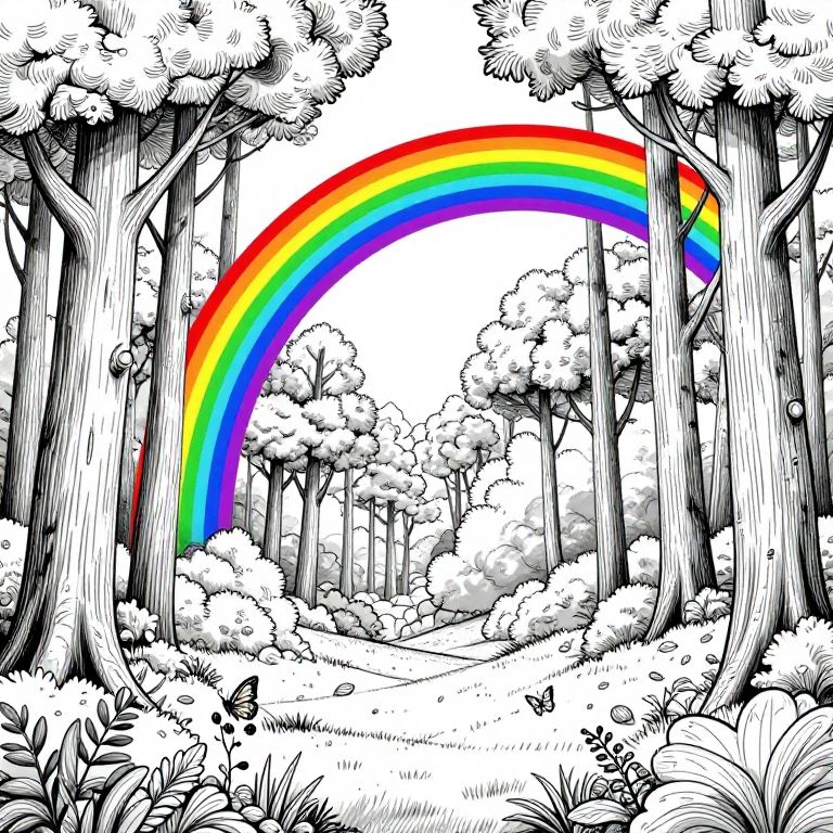 The image presents a detailed black and white coloring page background, featuring a serene Irish forest scene. A prominent rainbow arches gracefully across the sky, its vibrant colors contrasting sharply with the monochromatic surroundings. The forest is dense with tall trees, their trunks and branches intricately drawn, creating a sense of depth and complexity. A clear spot in the forest, possibly a clearing or a path, is visible, leading the eye towards the rainbow. The ground is adorned with various plants and foliage, adding texture and detail to the scene. A small butterfly flutters near the clearing, its delicate wings adding a touch of life to the otherwise still landscape. The overall composition is balanced, with the rainbow serving as a focal point that draws the viewer's attention through the forest and into the sky.