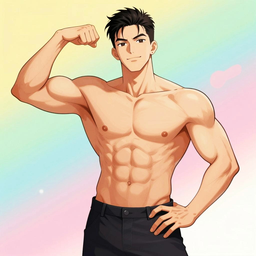 An anime-styled illustration of a muscular man showcasing his fit physique, emphasizing a strong and healthy lifestyle theme, set against a vibrant, colorful background.