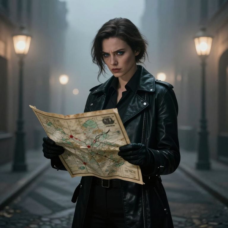 A photograph-like CGI image depicts a determined woman with pale skin and dark, slightly messy hair standing in a foggy, narrow street at night. She wears a black leather jacket over a black shirt, and black gloves, holding an aged, yellowed map with red and green markings. Her intense, focused expression is highlighted by dark eye makeup. The street is lined with old, glowing street lamps, and the fog creates a misty, mysterious atmosphere. The cobblestone path and blurred, dimly lit buildings in the background add to the scene's moody, suspenseful vibe.