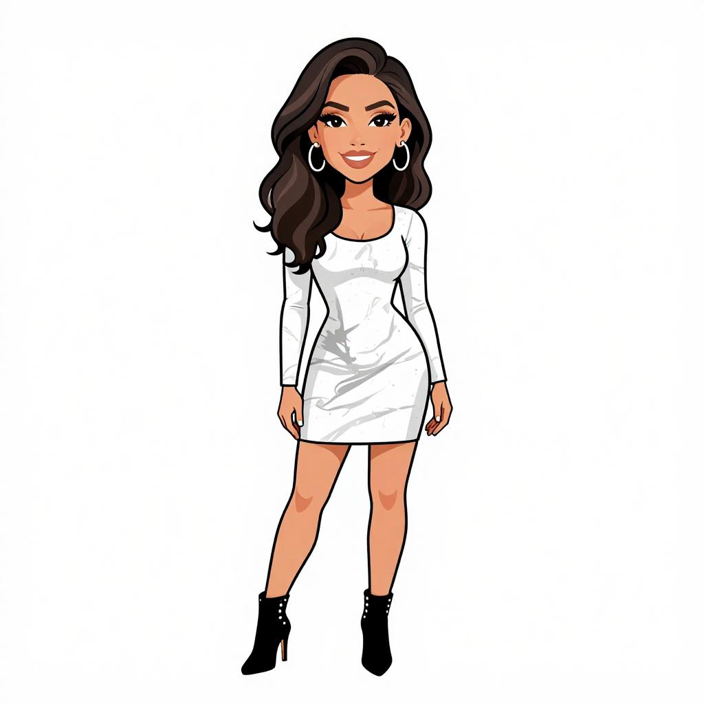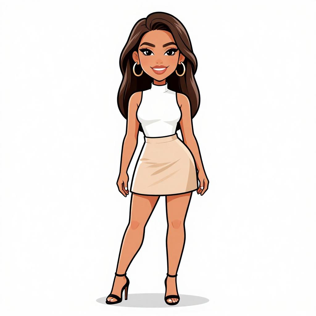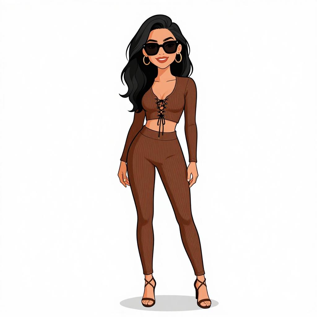 Woman with pretty face and pretty hair. smiling Woman, contemporary, form-fitting ribbed jumpsuit in rich brown, square neckline, thin straps, full-length pants, clear high-heeled sandals, minimal accessories, white seamless background --sref 1467