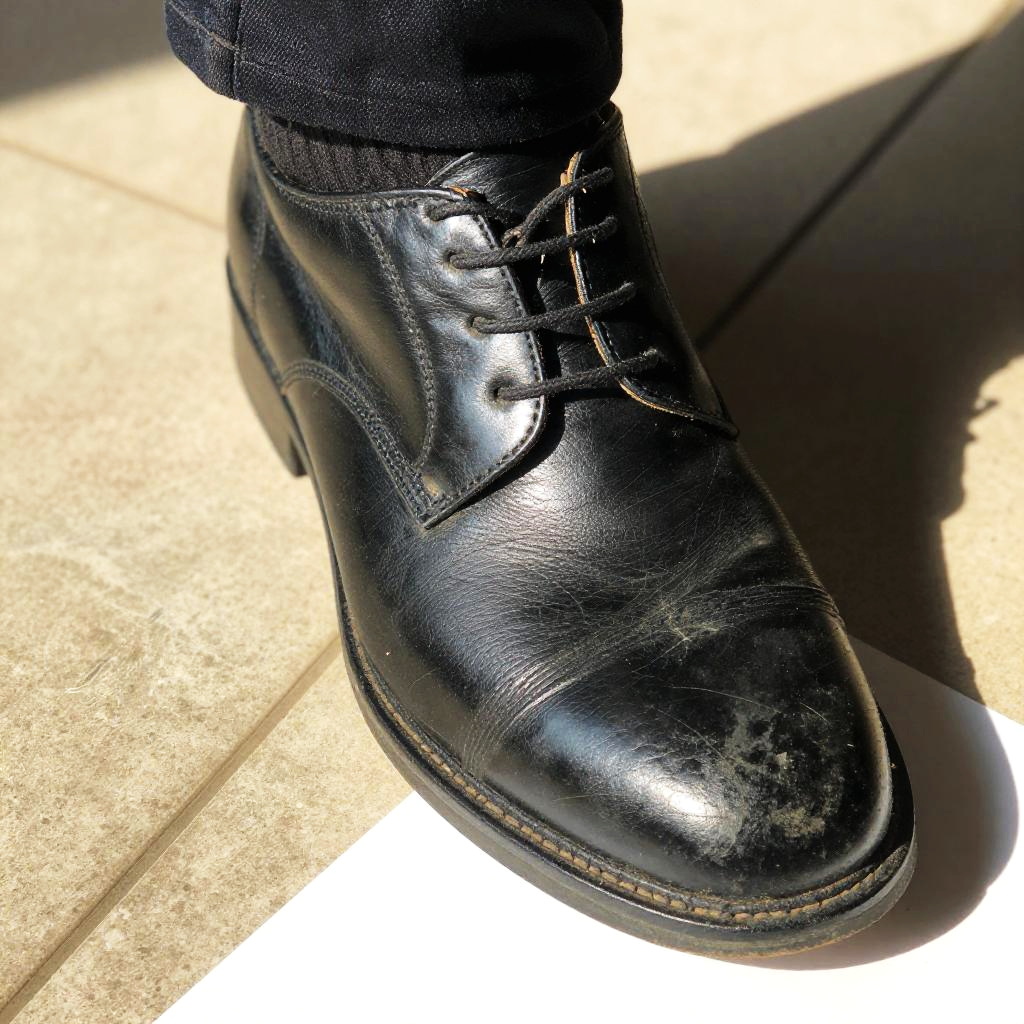 Close-up photo of a well-worn black leather shoe with a shiny, slightly cracked surface. The shoe is stepping on a bright white object on a beige tiled floor. The sunlight creates a stark contrast, highlighting the texture of the leather and the tiles. The angle emphasizes the shoe's creases and the object's sharpness.