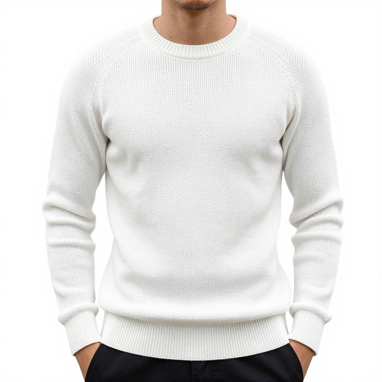 Photograph of a person from the shoulders down to the waist, wearing a white, knit, long-sleeve sweater with a ribbed texture. The sweater is slightly fitted, and the person's hands are in their black pants pockets. The background is plain white, making the person and their sweater the focal point. The person has a light skin tone and short, dark hair.