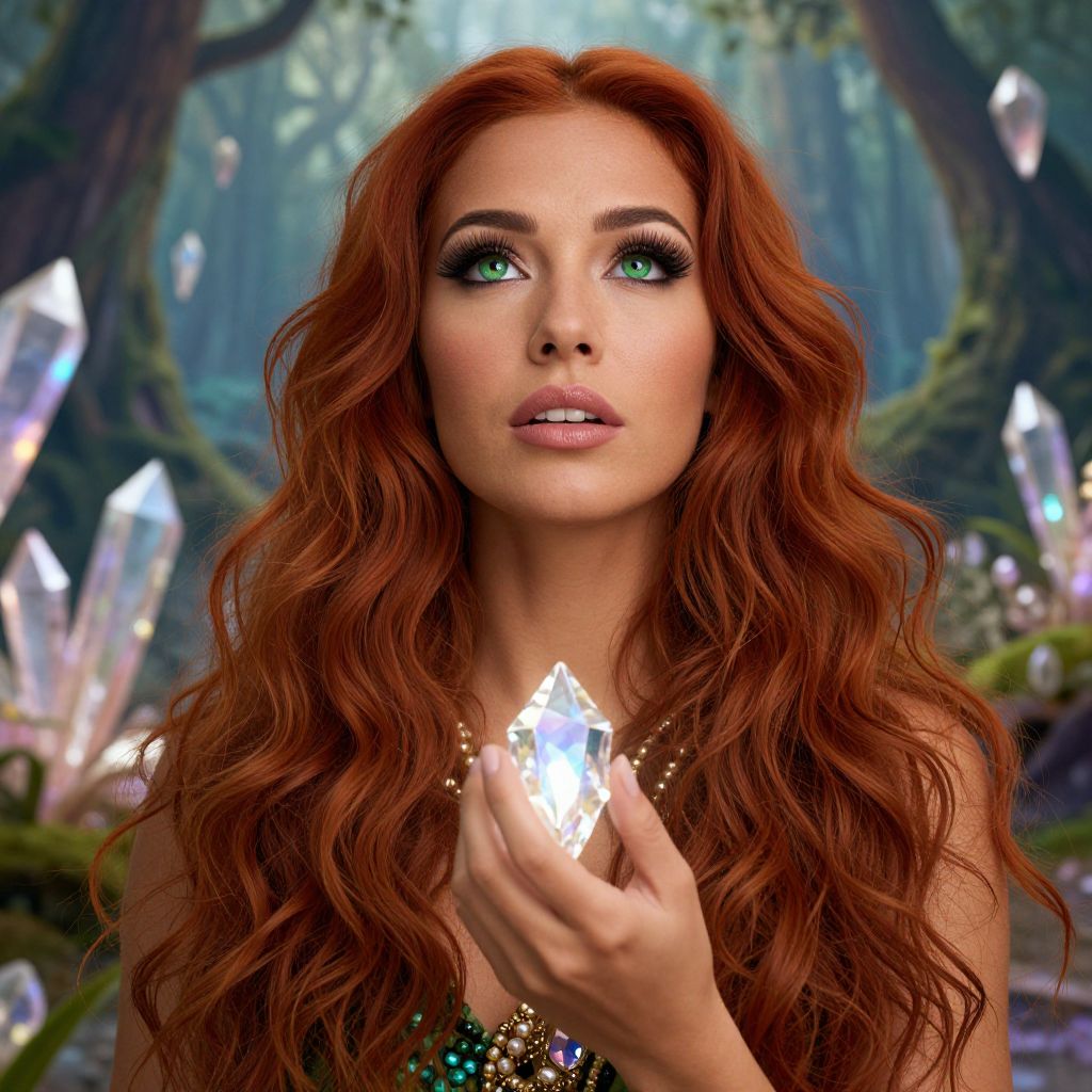 Digital fantasy portrait of a red-haired woman with green eyes, holding a glowing crystal, in a mystical forest with crystalline formations.