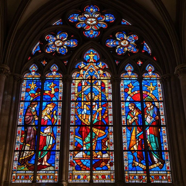 Vibrant gothic stained glass patterns depicting intricate symmetrical designs and pointed arches, rich blues, reds, and golds shining through, ancient cathedral setting with beams of light highlighting the craftsmanship, ornate and detailed art nouveau influence
