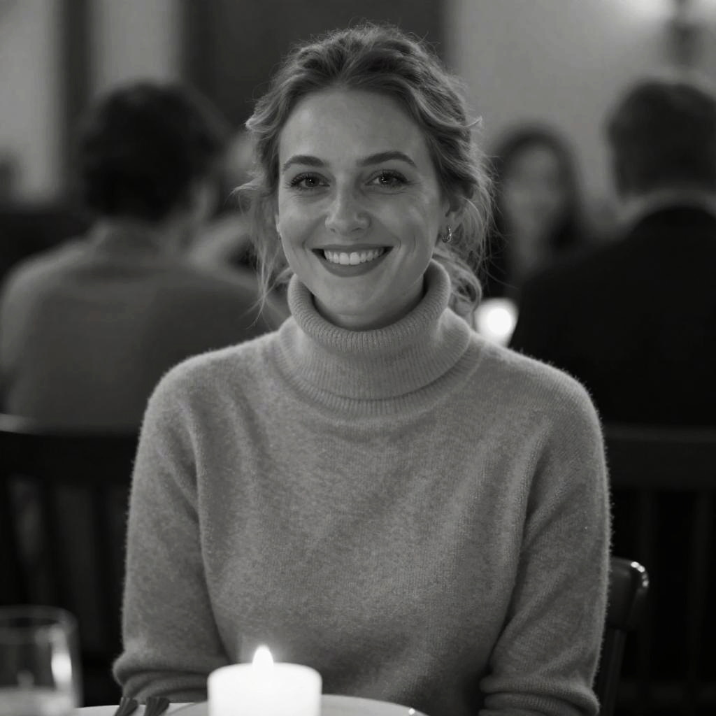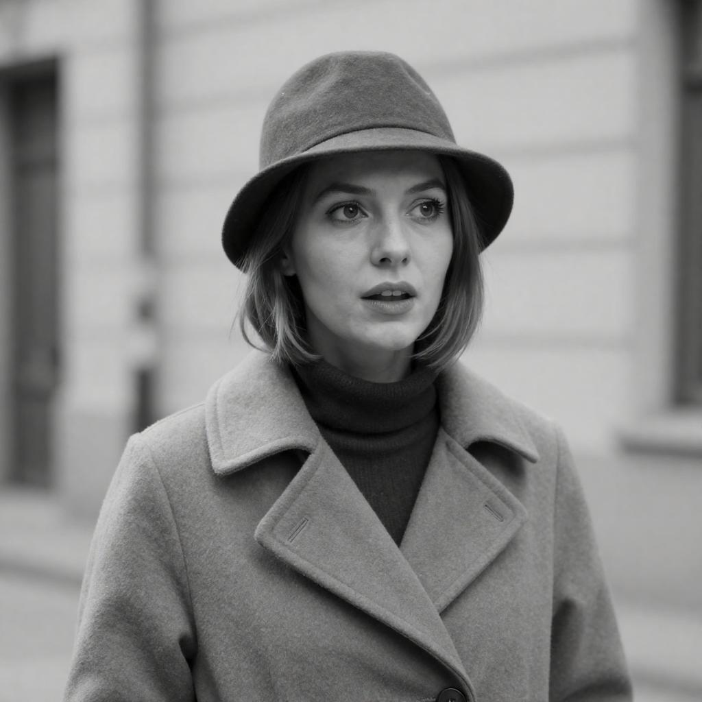 Black-and-white photograph of a woman with light skin and short hair, wearing a hooded coat and hat, looking to the right with an open mouth. She has a slightly surprised expression. The background is blurred with vertical lines. The image has a grayscale, high-contrast style.