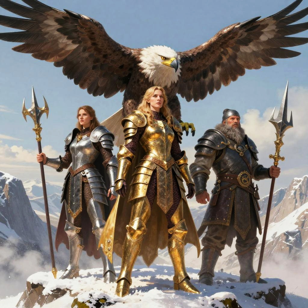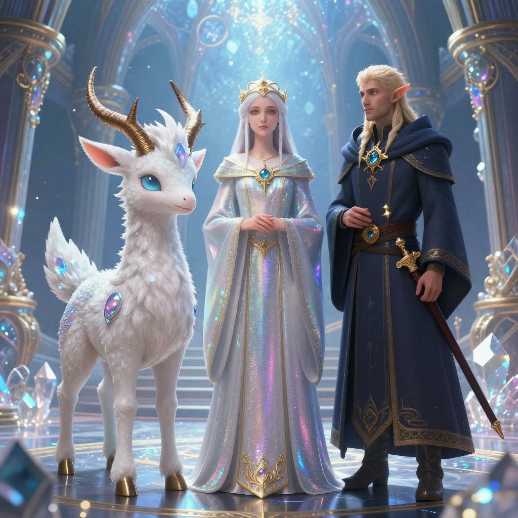 A celestial pegacorn, a priestess with shimmering robes, and a half-elf mage, standing together in a radiant crystal palace, tranquil and reverent, styled for D&D, fantasy illustration, highly detailed
