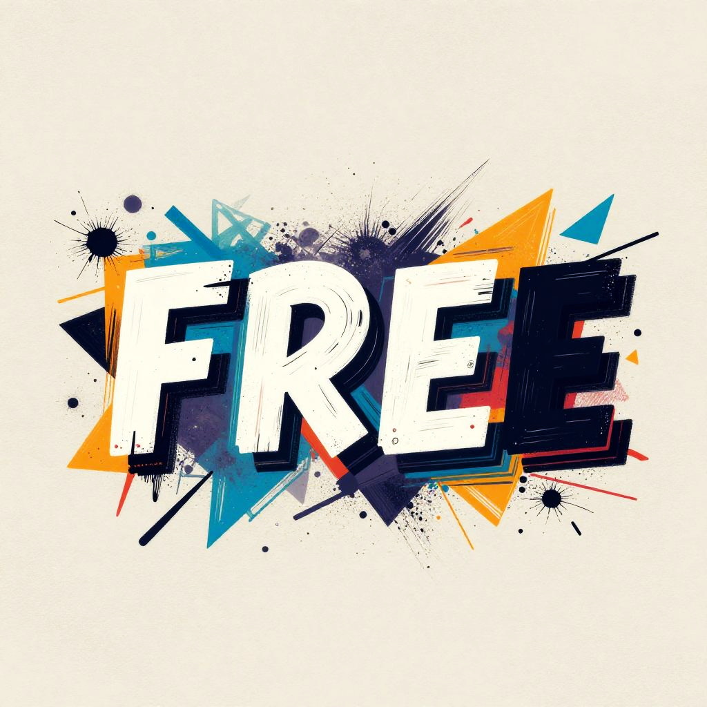 Free word art illustrating bold, blocky letters made of dynamic brush strokes and paint splatters, layered with geometric shapes and vibrant color contrasts, set against a raw canvas texture symbolizing the power of unrestricted expression.