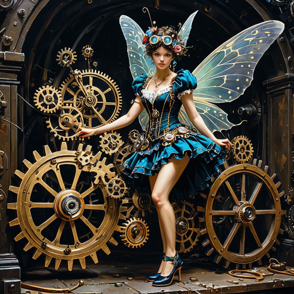 Child with blonde hair, in the style of steampunk collage, celebrity portraits, rusted metal, mechanical gears, realistic hyper-detail, crossed colors