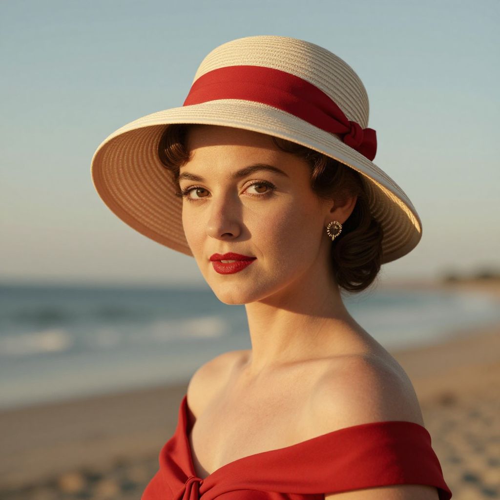 A vintage-inspired portrait captures a woman in a classic 1930s summer hat adorned with a red ribbon, complemented by a red off-the-shoulder dress and delicate earrings, set against a serene beach backdrop with golden-hour lighting, evoking a timeless, retro aesthetic.