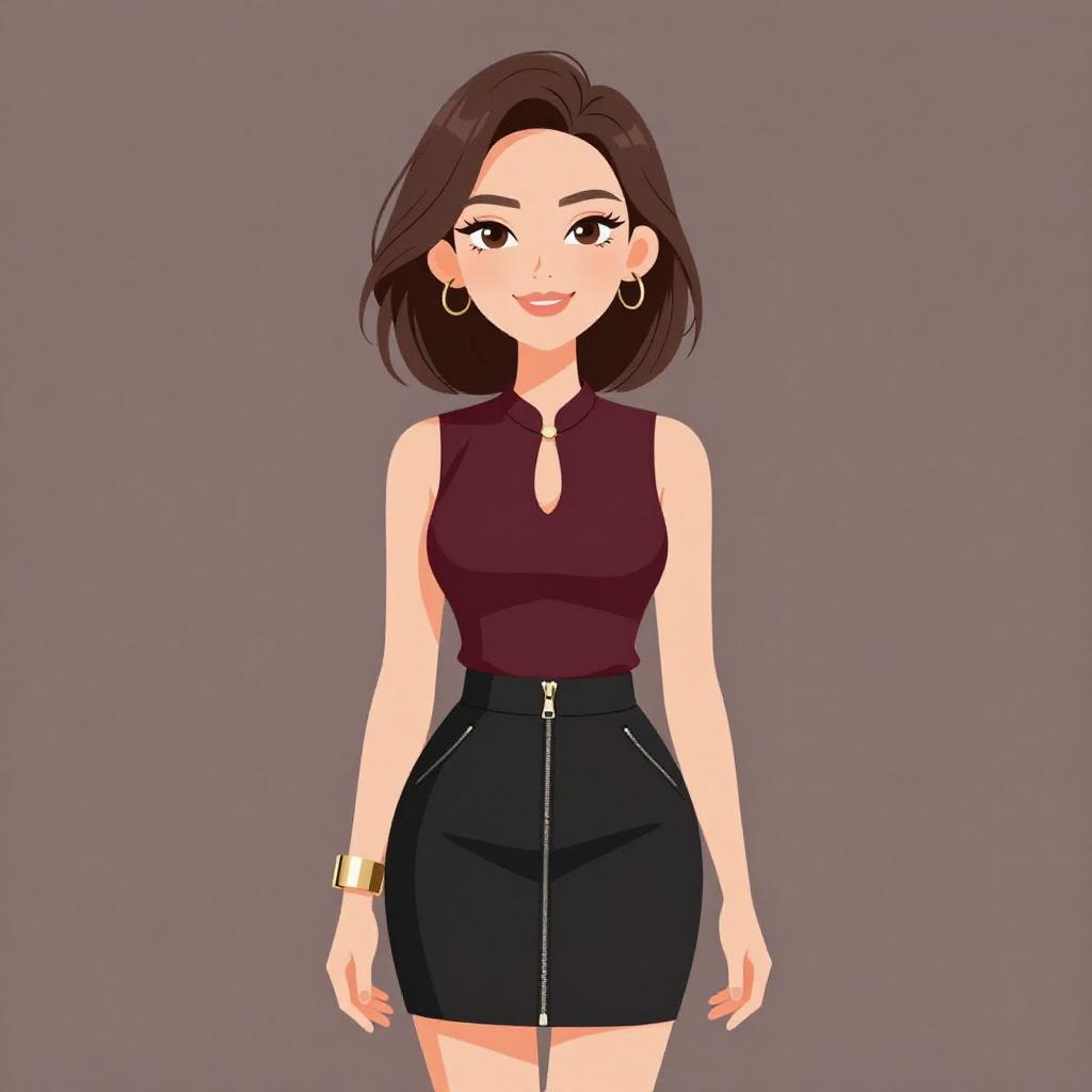 Woman with pretty face and pretty hair. smiling Woman, chic, sleeveless burgundy blouse with keyhole neckline, black mini skirt with frontal zipper accents, accessorized with a broad metal cuff bracelet. --sref 1467