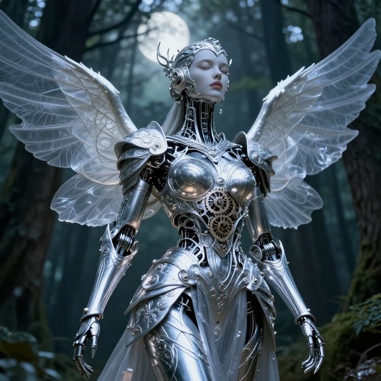 A graceful android stands amidst an enchanted forest, adorned in intricate filigree armor that shimmers like liquid silver under the moonlight. Her delicate wings unfurl as gossamer-like structures, contrasting with her metallic skin. From a bug's-eye view perspective, witness the intricate gears and cogs within her chest, softly pulsating through the armor. This captivating blend of advanced technology and timeless enchantment evokes awe and wonder, capturing the essence of both art forms in a visually striking tableau.