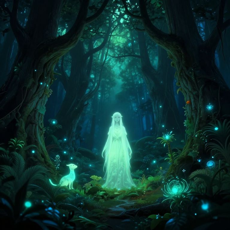 This digital art image depicts a mystical forest scene at night, illuminated by glowing blue and green bioluminescent lights. A translucent, ethereal figure resembling a ghostly woman stands in the center, emitting a bright, luminescent glow. To her left, a similarly glowing animal, possibly a fox, sits on the forest floor. The background consists of dark, towering trees with intricate branches and vines. Small, glowing fireflies and plants surround the scene, enhancing the magical atmosphere. The overall color palette is dominated by deep blues and greens, creating a mysterious, otherworldly ambiance.