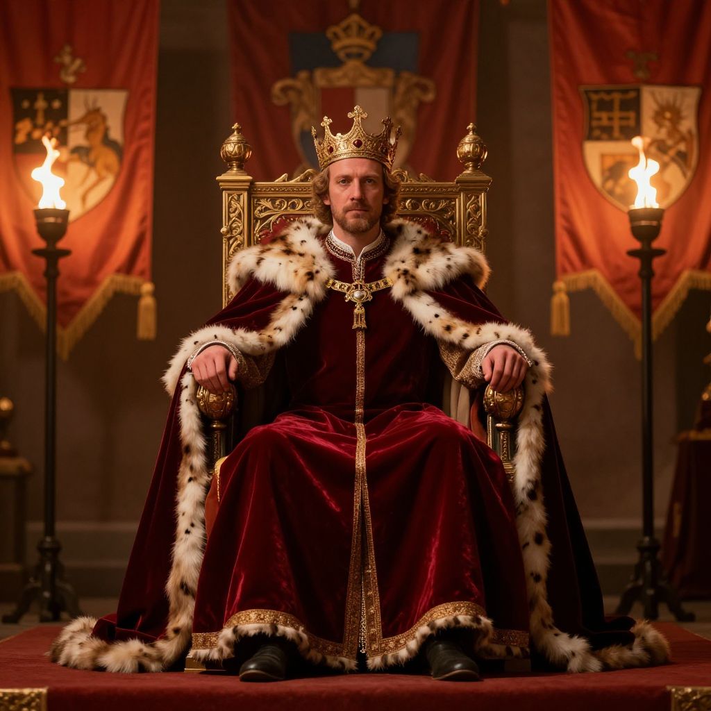 Photograph of a bearded man with light skin, wearing a golden crown and a rich, deep red velvet robe trimmed with white fur. He sits on an ornate, gold throne with intricate carvings, in a dimly lit room with two glowing torches and red banners displaying coats of arms in the background. His expression is serious and regal, with his hands resting on the throne's armrests. The room has a medieval, royal ambiance, enhanced by the warm, orange-red lighting that casts dramatic shadows.