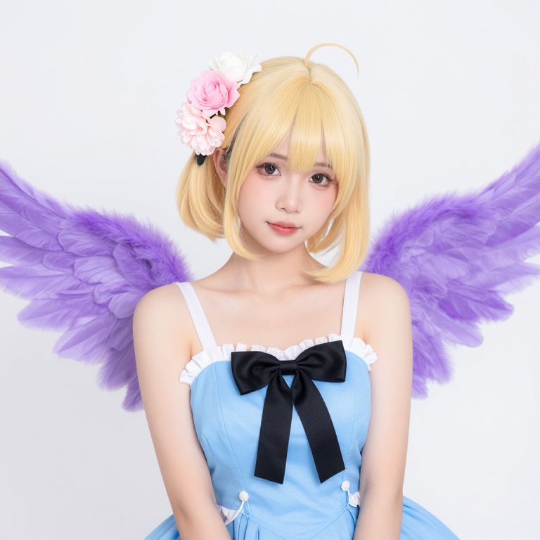 CGI image of an anime-style girl with blonde bob hair, pink flower hairpin, purple wings, blue dress with white lace and black bow,