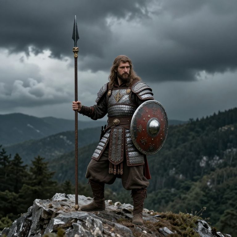 Illyrian ancient warrior standing on a rugged mountain ridge, wearing traditional armor with intricate patterns, holding a spear and shield, backdrop of a stormy sky and dense forest, dramatic lighting, realistic style.