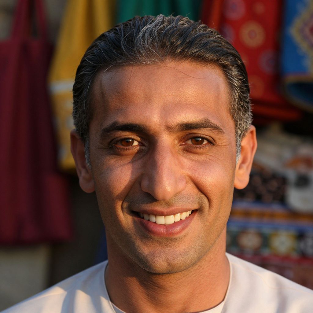 Craft a photorealistic portrait of an engaging Middle Eastern man with deep brown eyes and a beaming smile captured from above his head. His dark hair, streaked with silver, is styled traditionally. Soft golden light from the late afternoon bathes his rugged yet refined features, casting elongated shadows that enhance his face's depth. The vibrant market colors behind him frame this portrait, conveying warmth, resilience, cultural pride, and evoking curiosity about his rich heritage.