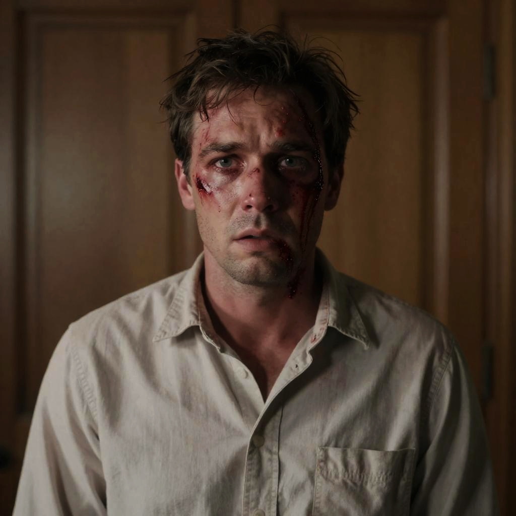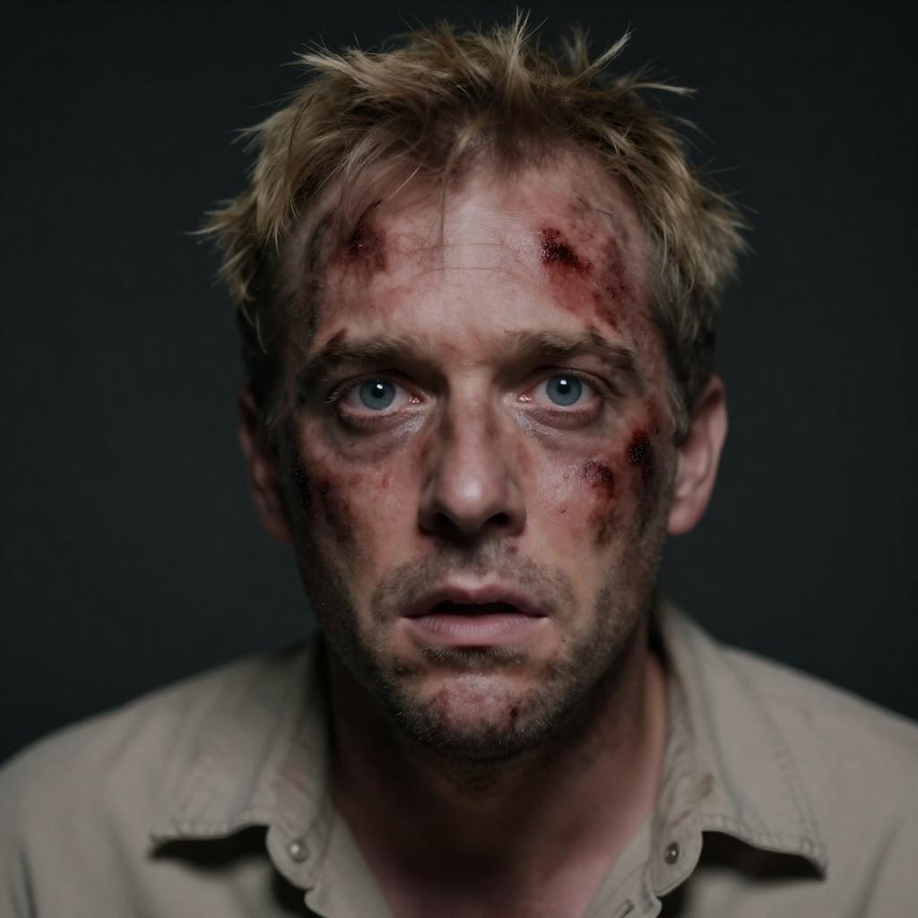 Close-up photograph of a middle-aged man with dirty, blood-streaked face, wide eyes, and slightly open mouth. He has short, disheveled blonde hair and wears a beige shirt. The background is dark, emphasizing his face. His expression is intense and fearful.