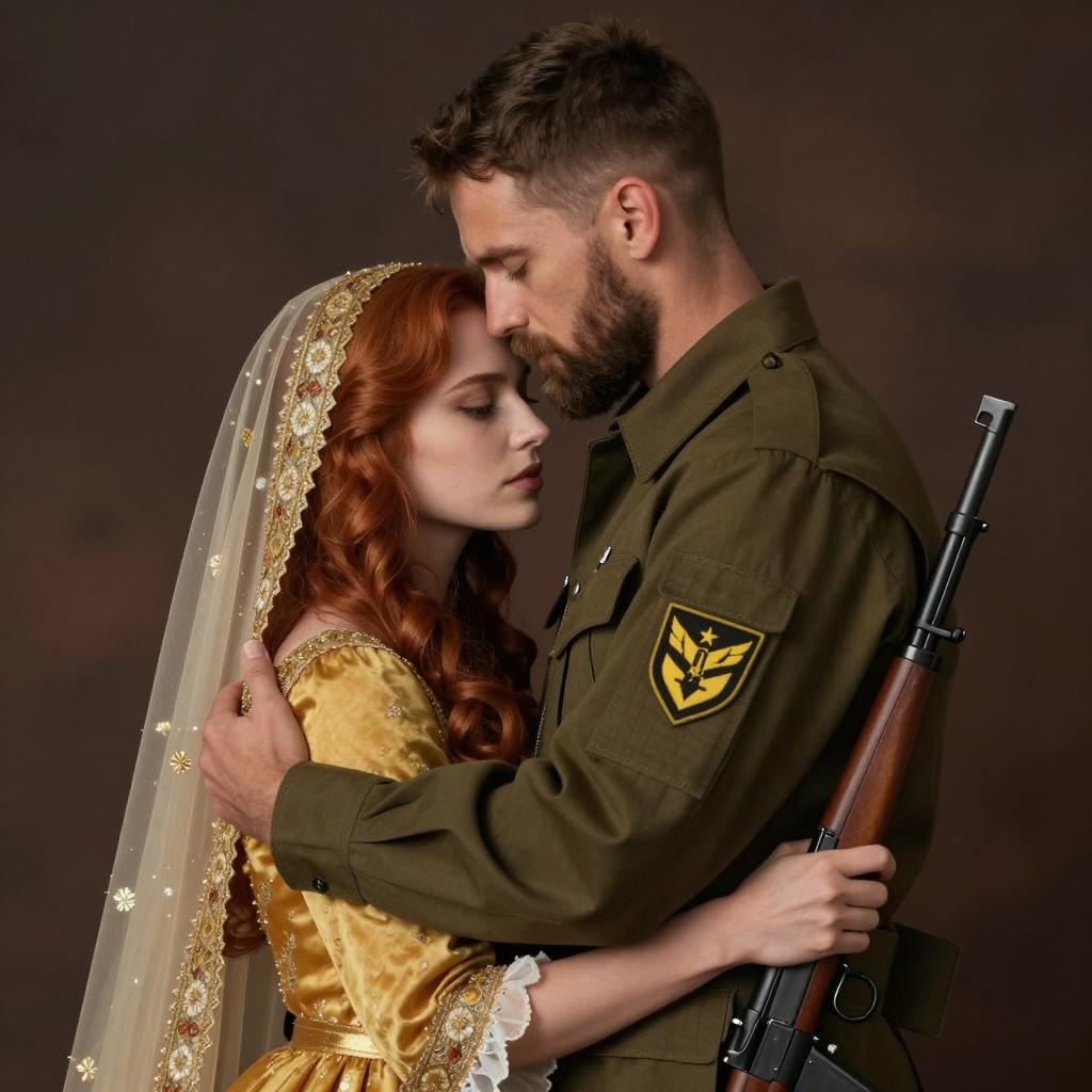 Oil painting of a bearded man with a cap, intense expression, wearing military-style clothing, being hugged from behind by a blonde girl with braided hair, red bead necklace. Dark, abstract background. The man's face is front-facing, girl's back. Two people.
