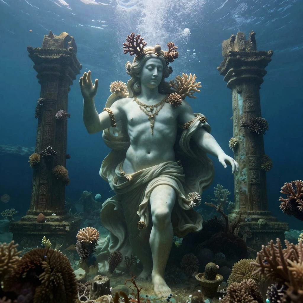 Enigma from the sunken temples, hidden secrets veil the depths, in baroque painting style, emerging from underwater ruins, with ancient coral crown, diffused aquatic haze