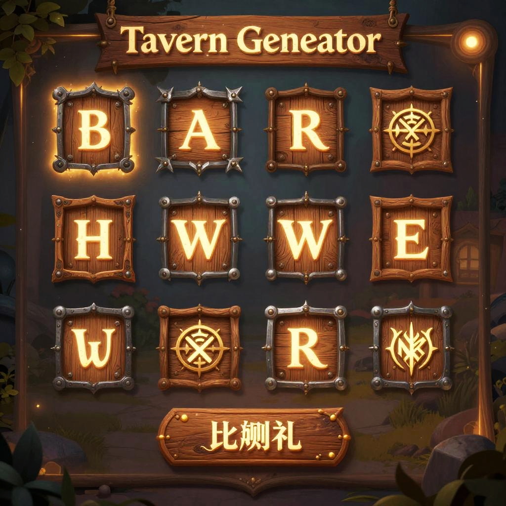 Digital artwork of a "Tavern Generator" game board, featuring nine glowing wooden square panels with metallic trim, arranged in a 3x3 grid. Each panel displays a large, illuminated letter in white: B, A, R, H, W, E, U, R, and a symbol. The top panel has "Tavern Generator" in bold, golden letters. A dark blue background with subtle foliage and a dimly lit, rustic tavern setting is visible. Bottom panel has additional glowing text in a Chinese character. The scene is illuminated by soft, ambient light, enhancing the wooden texture and metallic accents.