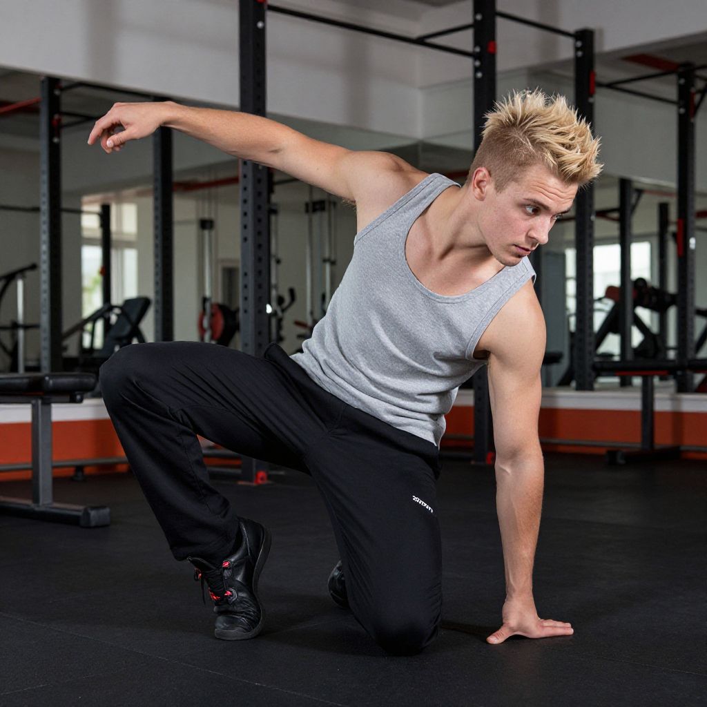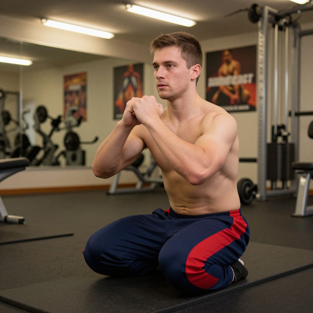 A fit man in his late 20s with short brown hair and a focused expression is training at a fitness center, wearing high-waisted, bold patterned sporty bottoms in navy blue and red stripes, sitting on a mat doing squats, with mirrors and exercise equipment in the background, fluorescent lighting and a gym wall with motivational posters.
