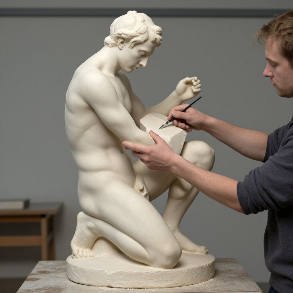 Photograph of an elderly sculptor, wearing glasses and white shirt, meticulously detailing a nude, unfinished, white marble statue in a dimly lit studio