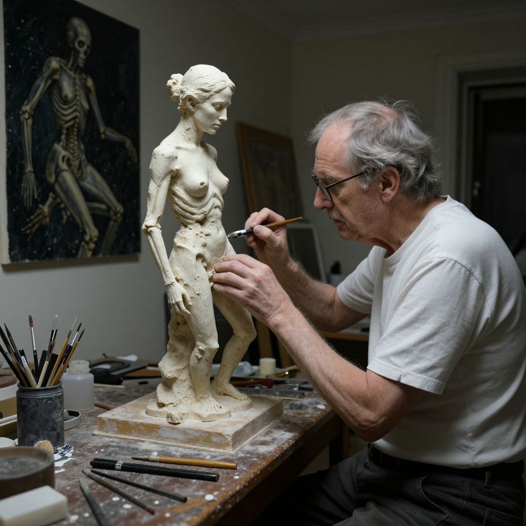 In a dimly lit artist's atelier, an elderly man with glasses is meticulously working on a sculpture of a human figure, which appears to be a distorted, skeletal representation of a woman. The sculpture, with its exposed bones and skin, is placed on a wooden table, surrounded by various art supplies and tools. To the left, a painting of a similarly skeletal figure hangs on the wall, adding to the eerie atmosphere. The artist, dressed in a simple white shirt, is focused on the sculpture, using a small brush to refine the details. The room is filled with a sense of concentration and dedication, as the artist's hands gently manipulate the sculpture, bringing it to life with his skilled touch. The overall composition is dynamic, with the sculpture and the artist's hands creating a focal point that draws the viewer's eye into the scene. The interplay of light and shadow, along with the intricate details of the sculpture, showcases the artist's mastery of photorealism and surrealism.