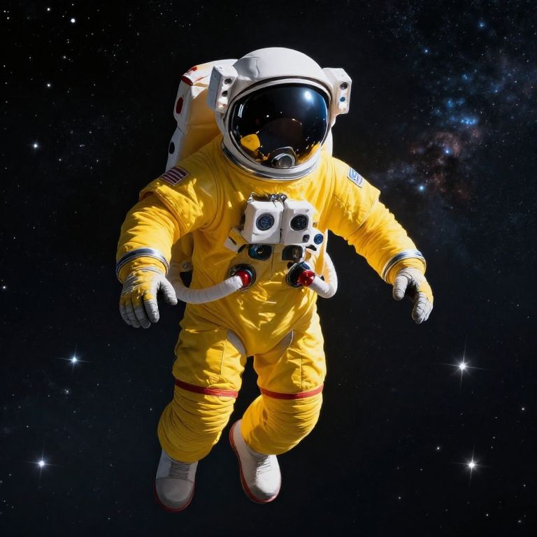 Yellow astronaut floating serenely in the vastness of space, stars twinkling in the background, vivid yellow space suit reflecting cosmic light, futuristic helmet visor glowing softly, cosmic nebula in the distance, high detail digital art.
