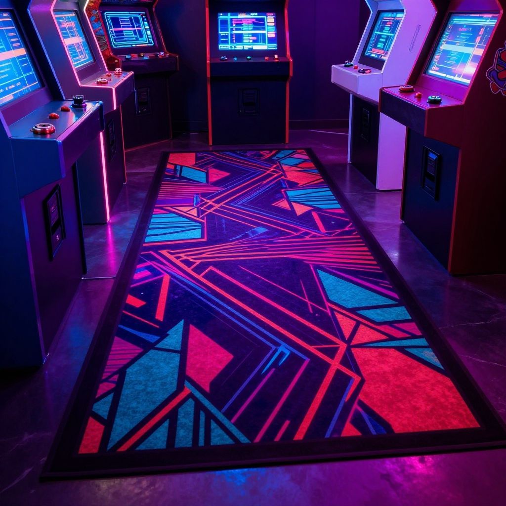 Neon arcade carpet with dynamic geometric designs, vivid neon colors reflecting off shiny surfaces, surrounded by arcade machines, nostalgic 80s cyberpunk style, ultra detailed